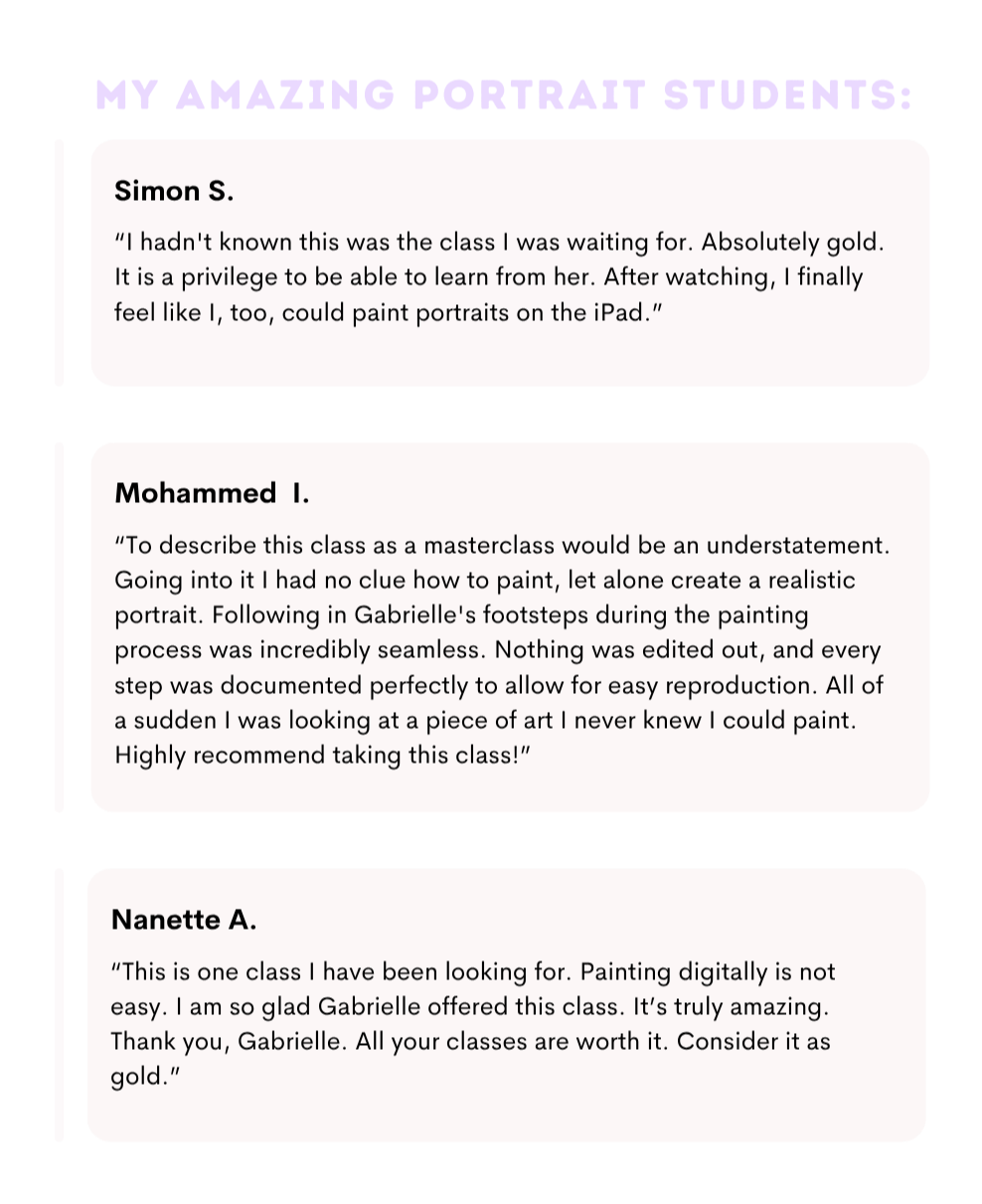 When this signature course releases in 2026, this will be your all-in-one roadmap for painting expressive, beautiful, painterly portraits in Procreate. Whether youâre brand new to portrait painting or ready to deepen your skills, this course will walk you step-by-step through the process I use to create digital portraits. Youâll learn how to choose references, simplify proportions, paint light, blend colors, add texture, and so much more.